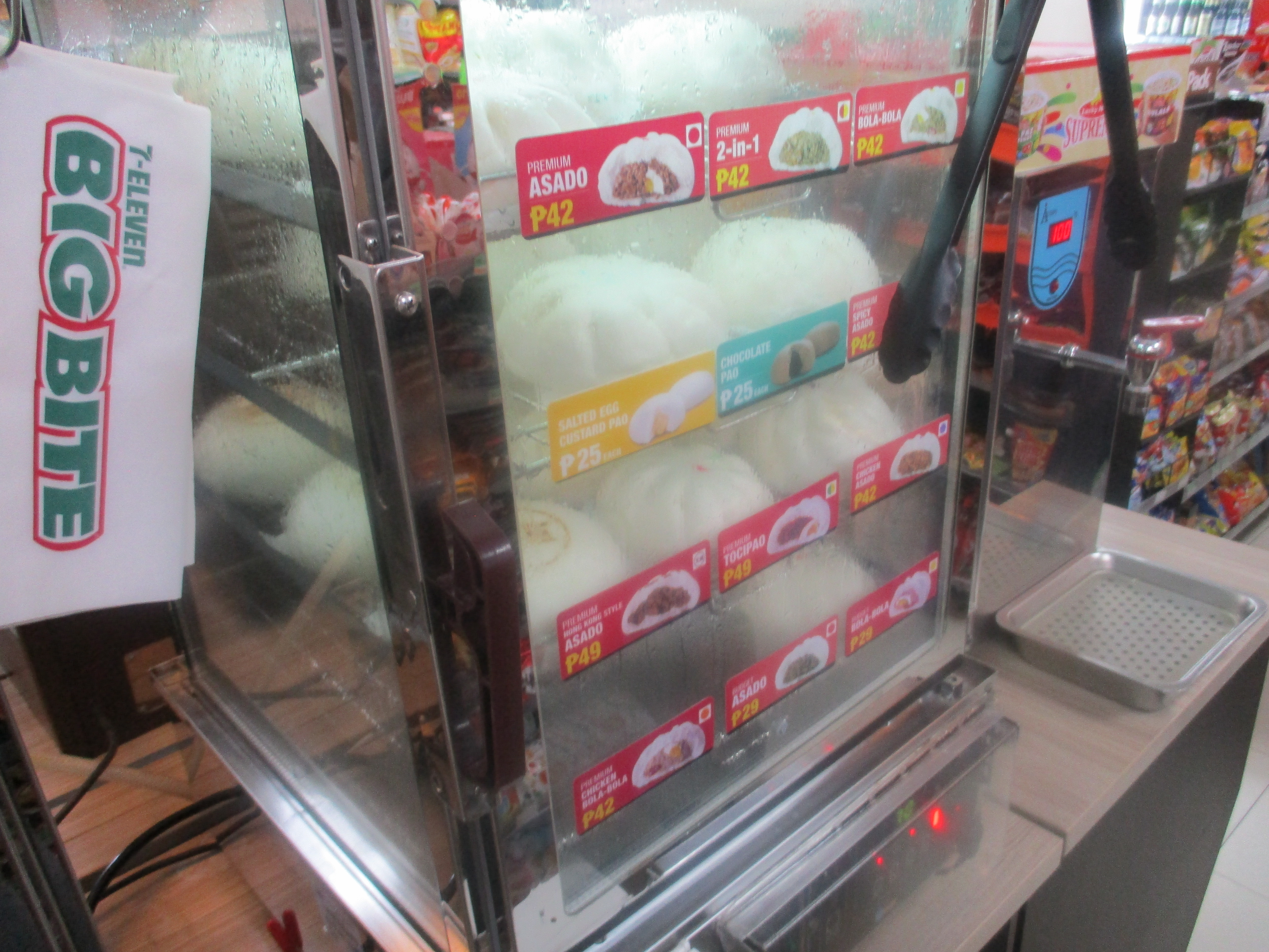 では、さっそく、セブンイレブンの中に入ってみましょう。まずは、商品の陳列から。食べ物、雑貨、まあ、日本のコンビニと同じような感じです。なにやら、肉まんみたいなものもありますね~。