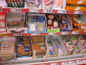 そして、精肉。フランスと同じで、加工肉のほうがおおいのですが、精肉もあります。きちんとパック詰めされているのが、ヨーロッパな感じですね。右下の方、豚肉の厚切りっぽく、やっぱり、トルコスーパーとは趣を異にします。